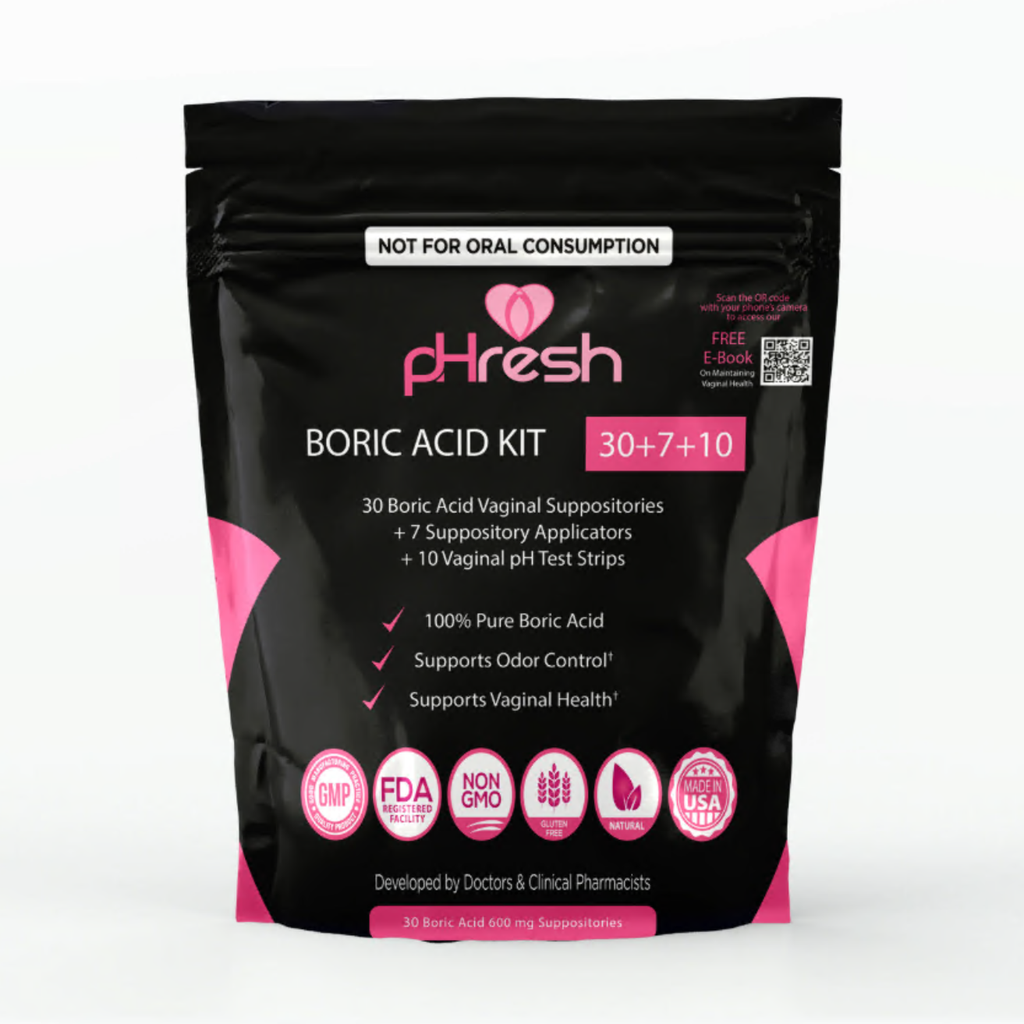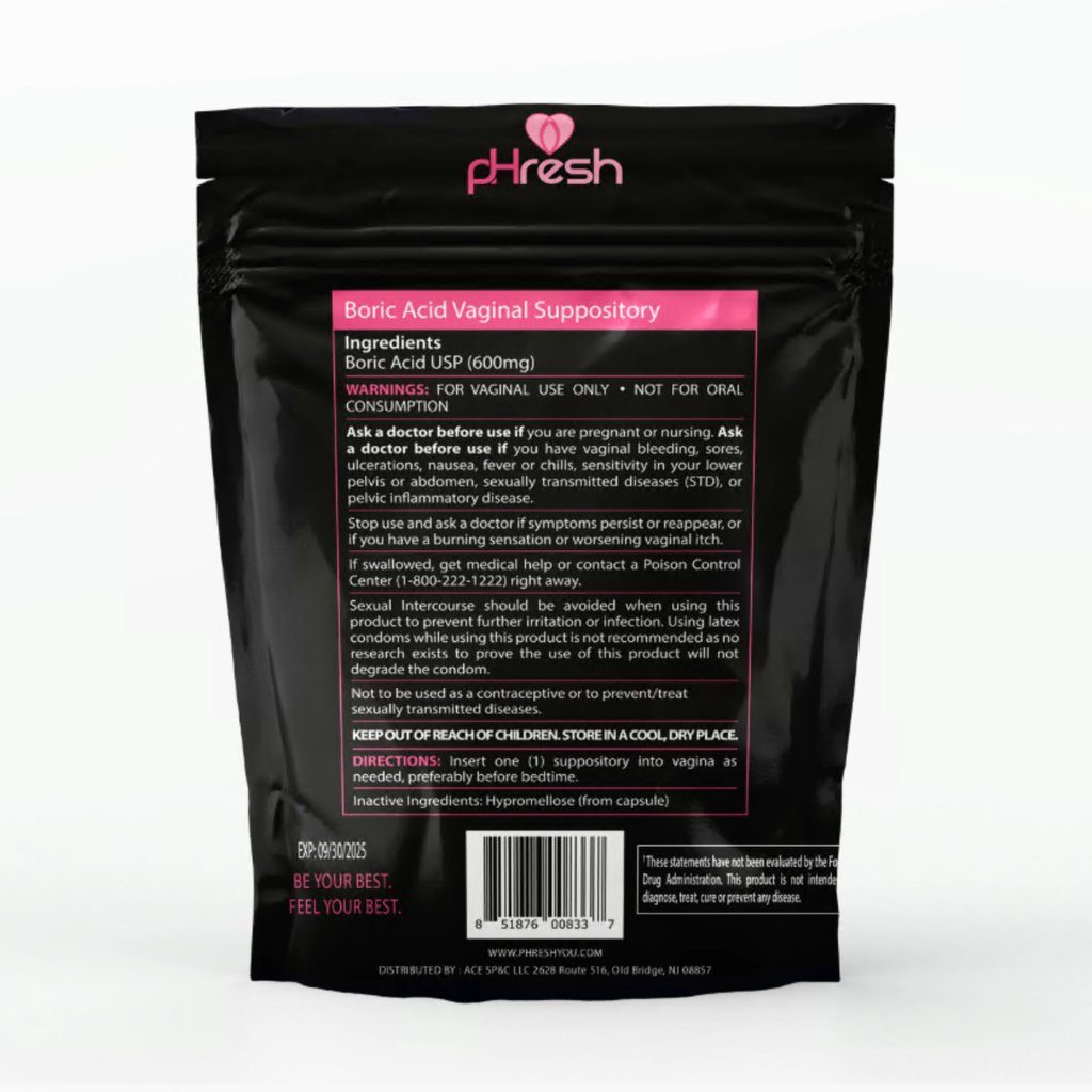 Includes 30 boric acid vaginal suppositories (600 mg each)